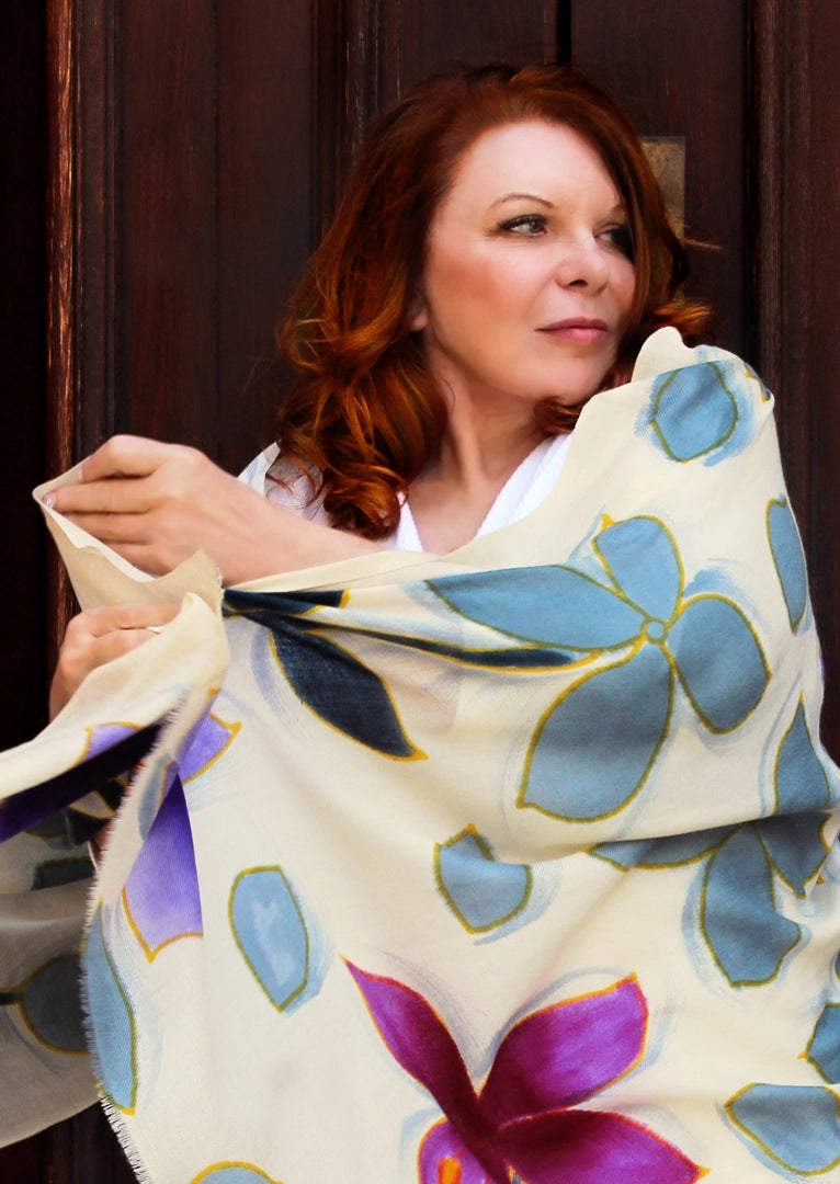 Luxuriöser, kuschelweicher, extrafeiner Kaschmir-Schal. Der helle Creme-Grundton bildet die ideale farbliche Bühne, auf der sich mit viel Liebe zum Detail handgemalte Blüten in lebhaftem Lila, Violett und Lichtgrau entfalten. Ein wahres Meisterwerk der Handwerkskunst.