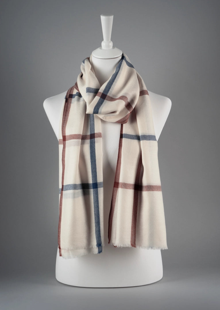 KASCHMIR-SCHAL Wollweiß · Rehbraun · Marineblau