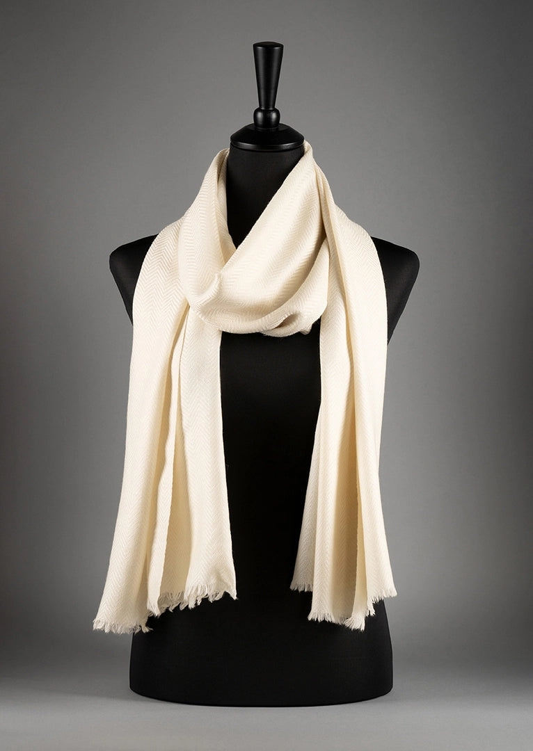 Luxuriöser, kuschelweicher, extrafeiner Kaschmir-Schal. Die Farbe Wollweiß ist ein perfekter Allrounder und mit jeder anderen Farbe Ihres Looks kombinierbar. Das Fischgrat-Muster gibt den extra Pfiff.