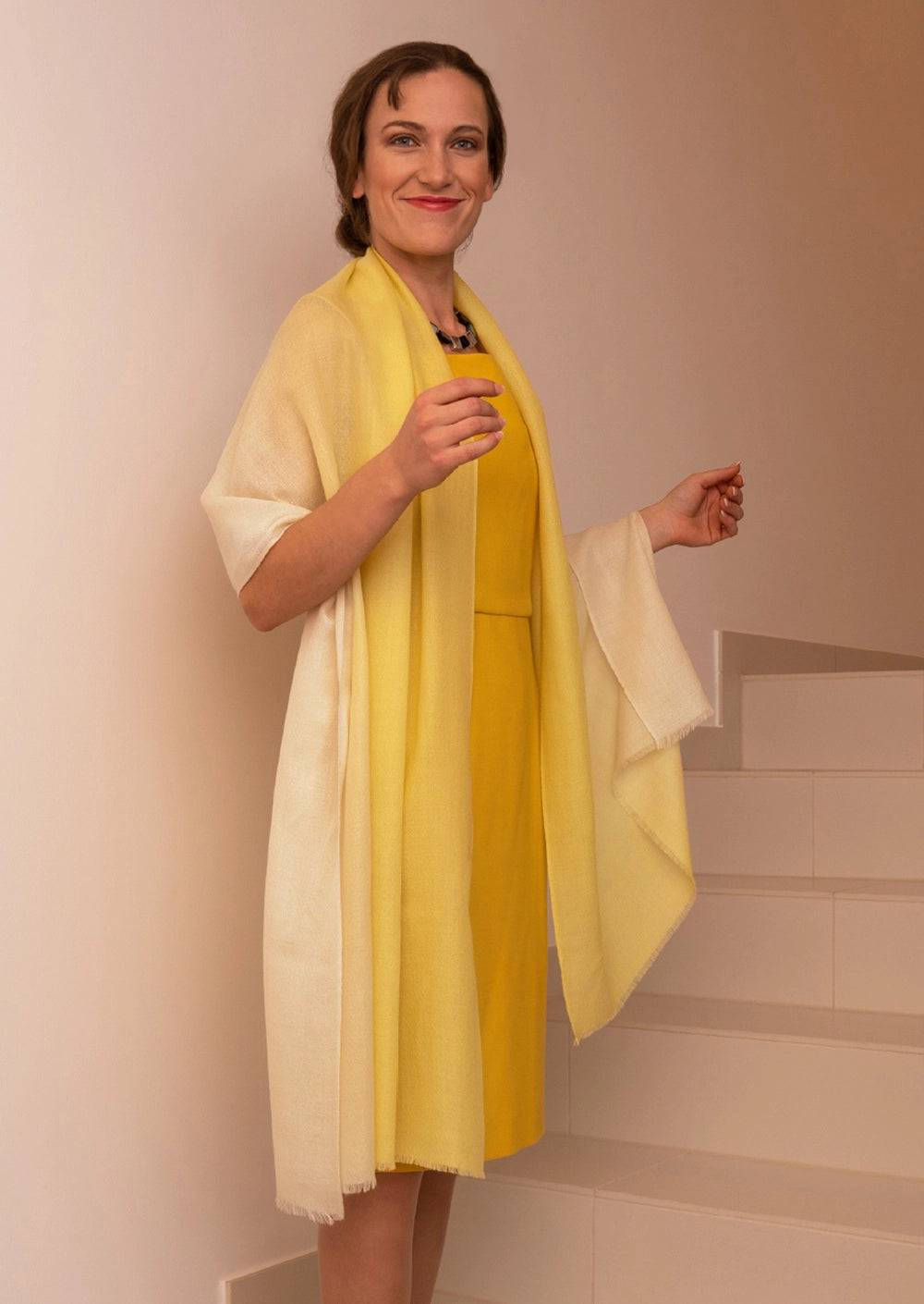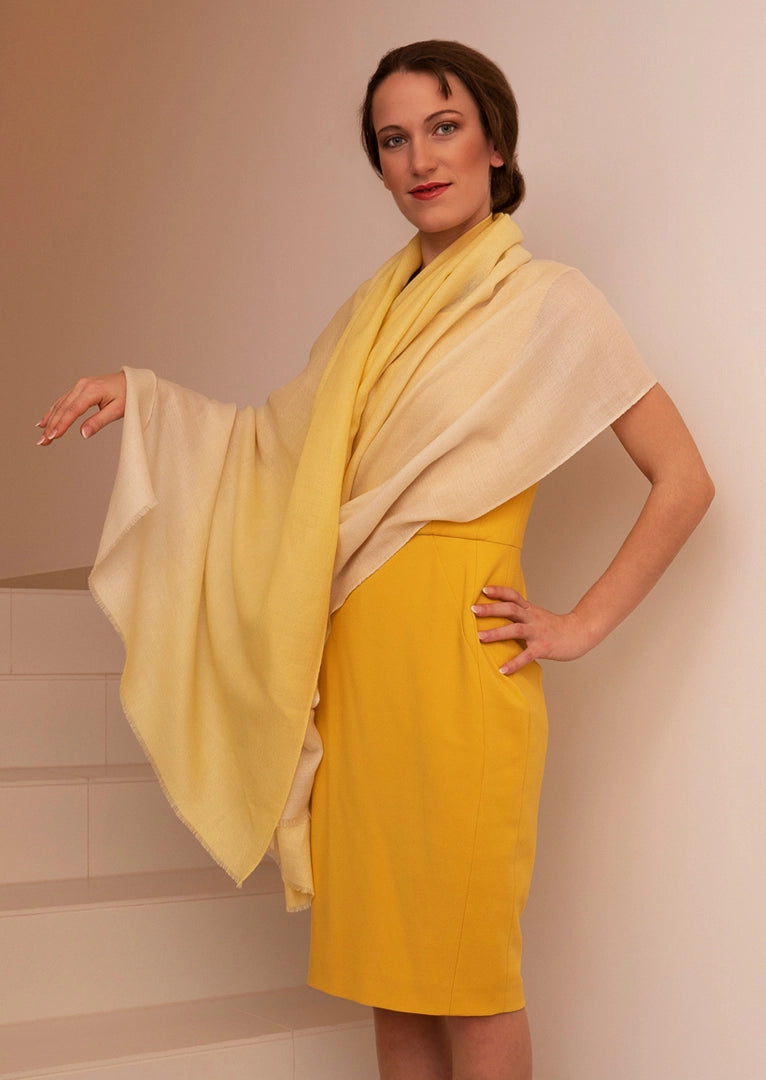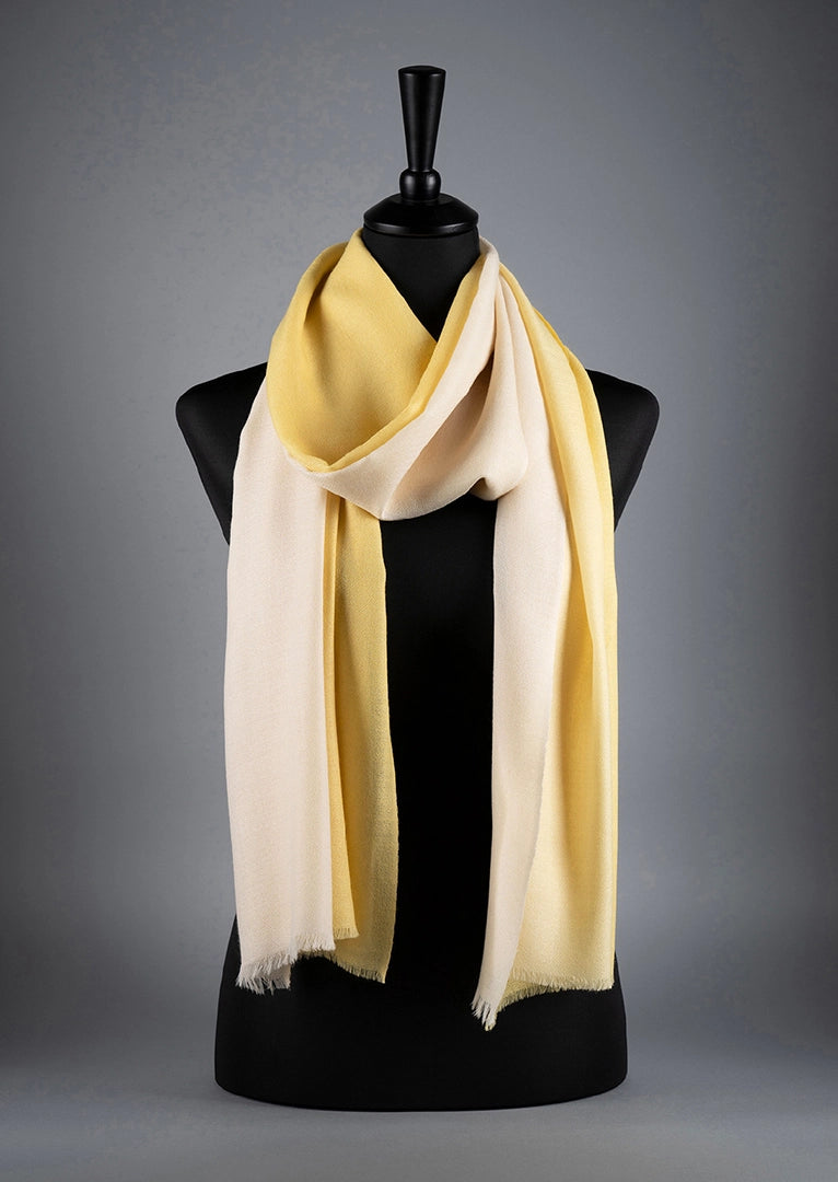 Luxuriöser, kuschelweicher, extrafeiner Kaschmir-Schal. Das fröhliche Zitronengelb geht eine perfekte Verbindung mit dem warmen Cremeton ein. Beide Farben – vertikaler Verlauf – gehen sanft ineinander über. Spielen Sie mit den Farben, variieren Sie, welche im Vordergrund stehen soll.