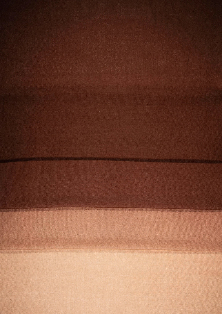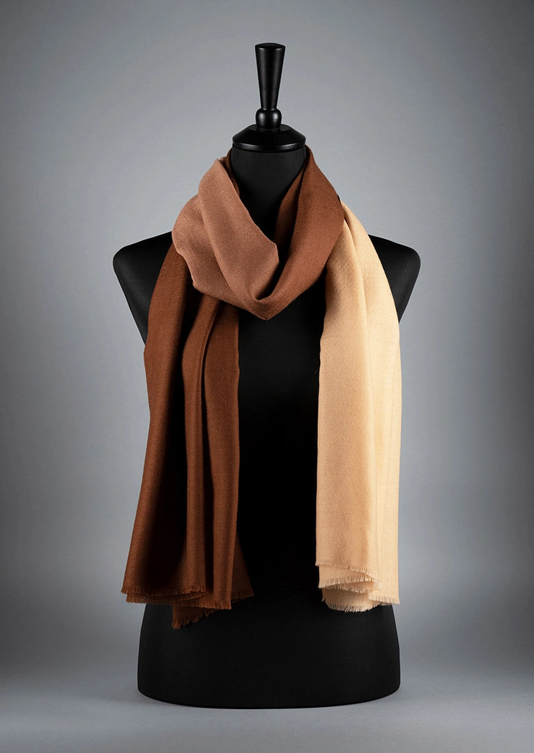 Luxuriöser, kuschelweicher, extrafeiner Kaschmir-Schal. Die erdige Farbe Kaffee verbindet sich harmonisch mit dem warmen Caramel-Ton. Beide Farben – horizontaler Verlauf – gehen sanft ineinander über. Spielen Sie mit den Farben, variieren Sie, welche im Vordergrund stehen soll.