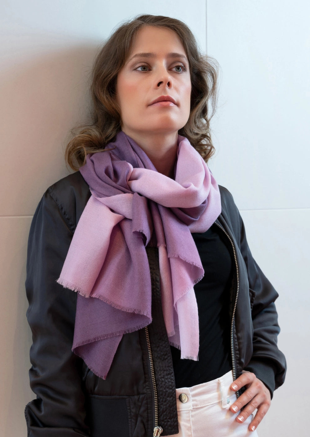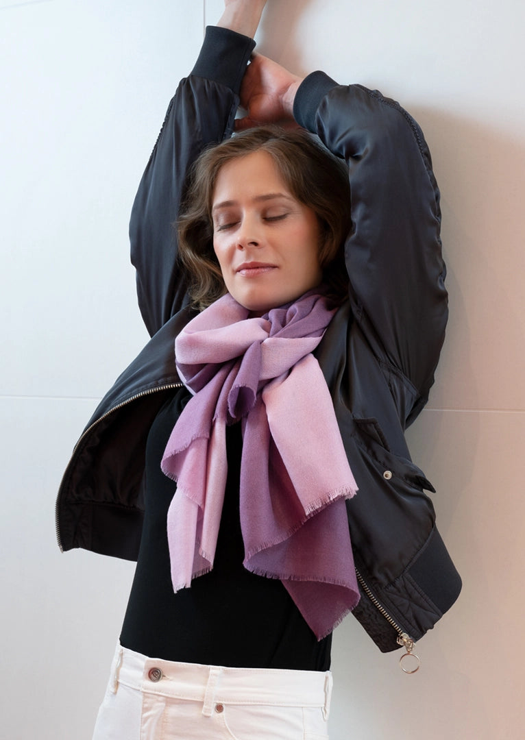 Luxuriöser, kuschelweicher, extrafeiner Kaschmir-Schal. Die Farben Lavendel und Mauve stehen für Anmut und Schönheit. Beide Farben – vertikaler Verlauf – gehen sanft ineinander über. Spielen Sie mit den Farben, variieren Sie, welche im Vordergrund stehen soll.