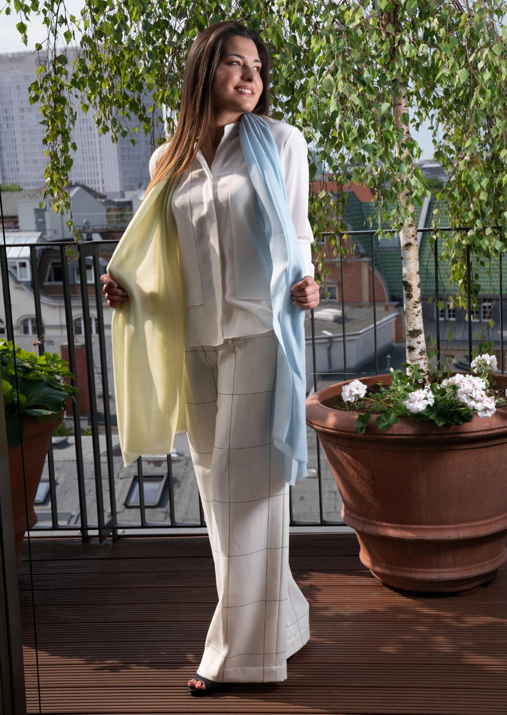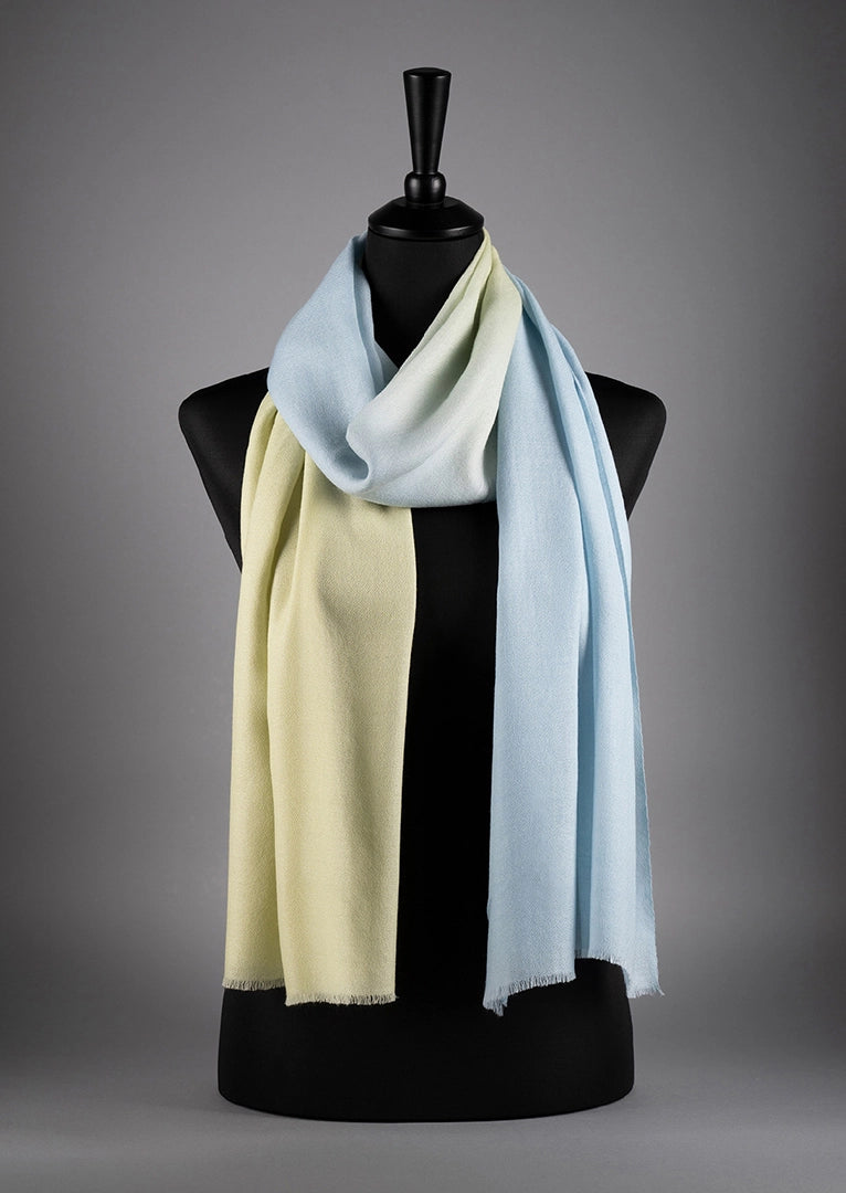 Luxuriöser, kuschelweicher, extrafeiner Kaschmir-Schal. Die beiden kühlen Farben Mintblau und Mintgrün stehen für natürliche Leichtigkeit und Frische. Beide Farben – vertikaler Verlauf – gehen sanft ineinander über. Spielen Sie mit den Farben, variieren Sie, welche im Vordergrund stehen soll.