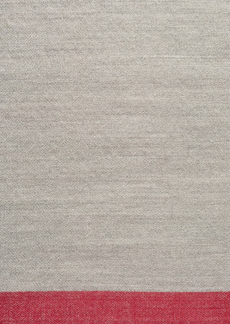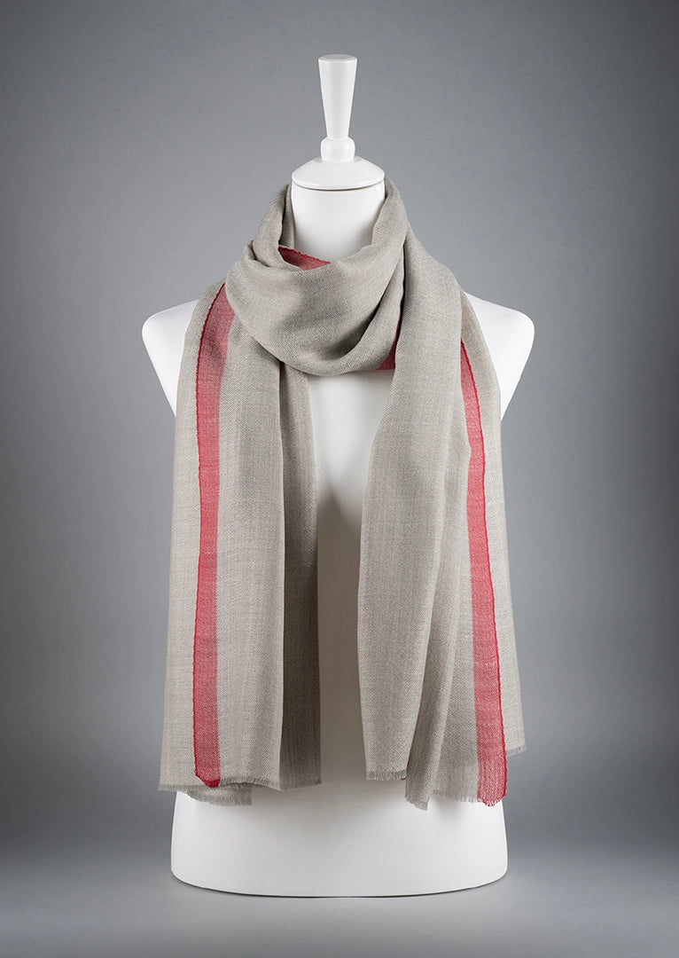 Luxuriöser, kuschelweicher, extrafeiner Kaschmir-Seide-Schal. Zeitlos schön durch die Verbindung von dezentem Nebelgrau und den Zinnober-roten Randstreifen.