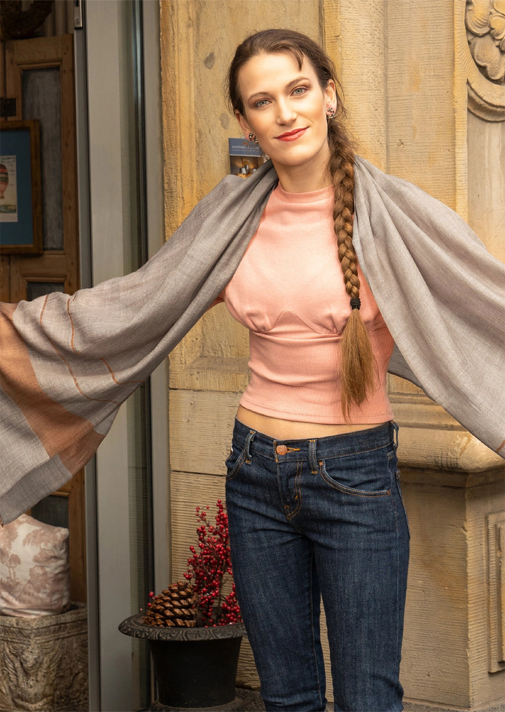 Dieser wunderschöne Kaschmir-Schal ist nicht nur ein luxuriöses Accessoire, sondern repräsentiert gleichzeitig die traditionsreiche Handwerkskunst aus Kaschmir. Jeder Schal ist handgefertigt nach Entwürfen, die wir sorgfältig und mit Herz gemeinsam mit unseren erfahrenen Partnern aus Kaschmir entwickeln.
